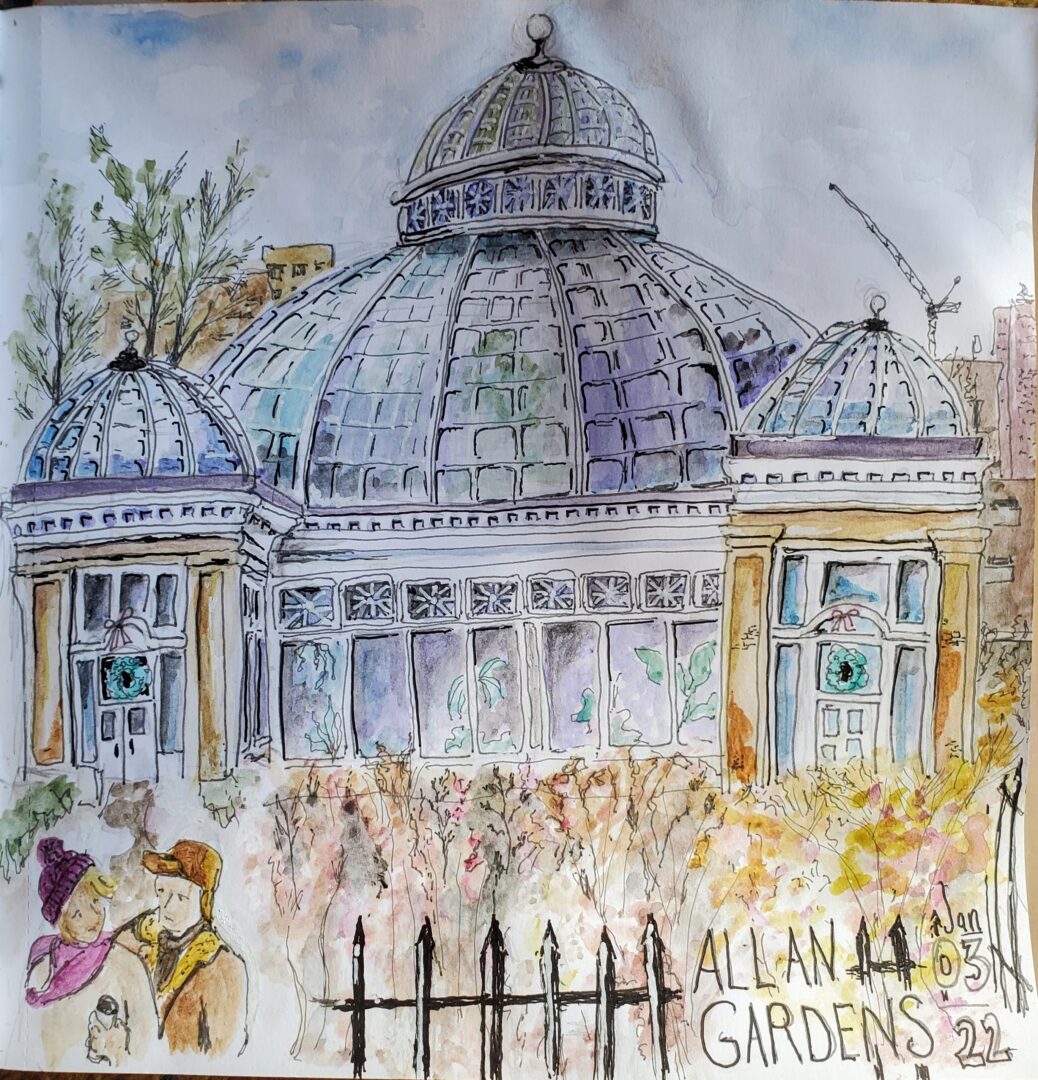 This greenhouse is in a park a few blocks from my home in Toronto. It opened for a few weeks to the public and then Omicron closed it down again. I had sketched a few of the plants in December, but it wasn’t open on this day in January.