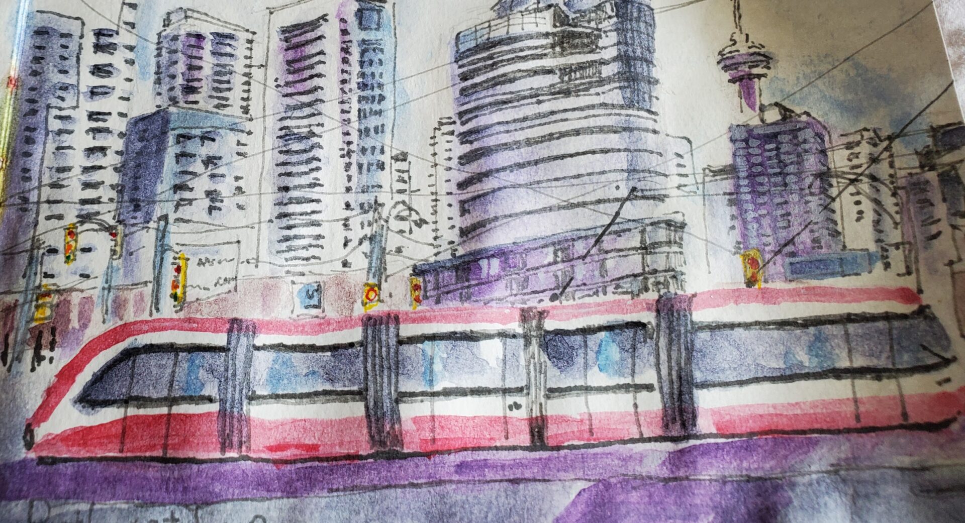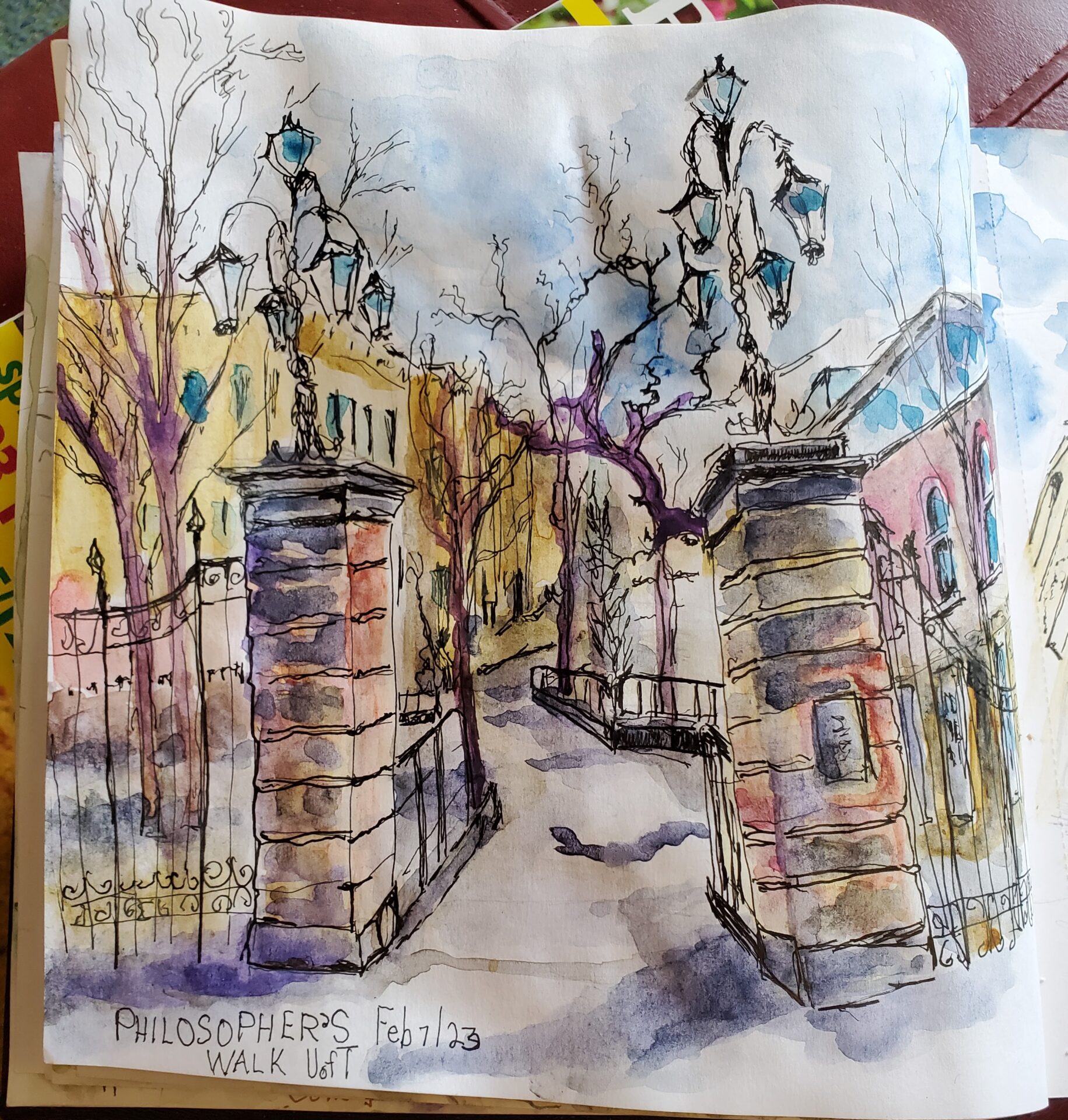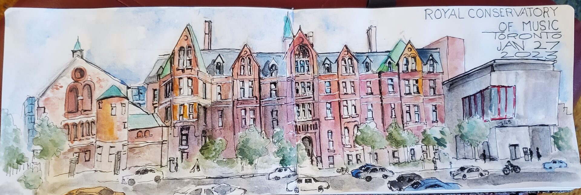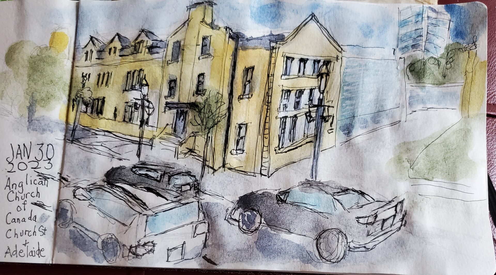 This house in Toronto’s Annex was purchased by St. Michael’s College, University of Toronto in 1920 and still serves as student housing. I wanted to sketch it because of it’s Hogwarts feeling and the unique brick buttresses under the upper storey tower room. These days it is connected to two additional houses on the block that collectively house about 70 students in double and single rooms. The Annex was Toronto’s first subdivision and is now a mixed neighbourhood of mansions, frat houses, rooming houses and houses converted into multi-unit dwellings.