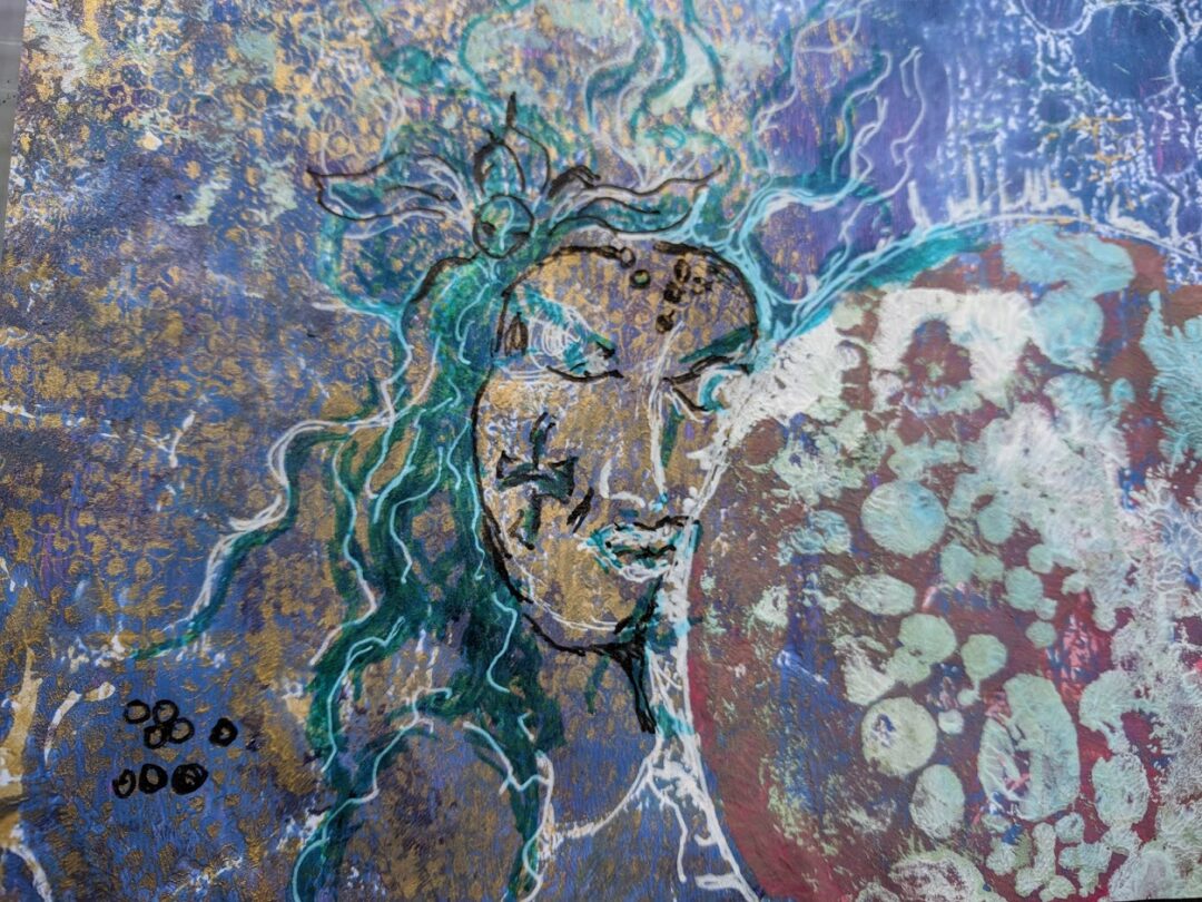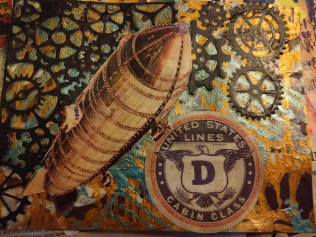 Don’t you love the colour blue? I’m looking forward to creating more blue images. This one came together more or less by accident. I saved the background image as I could immediately see it as useful for any blue construction but then one of my “paper doll” images happened to fall on top in my cuttings box and I noticed that it was a nice pairing.