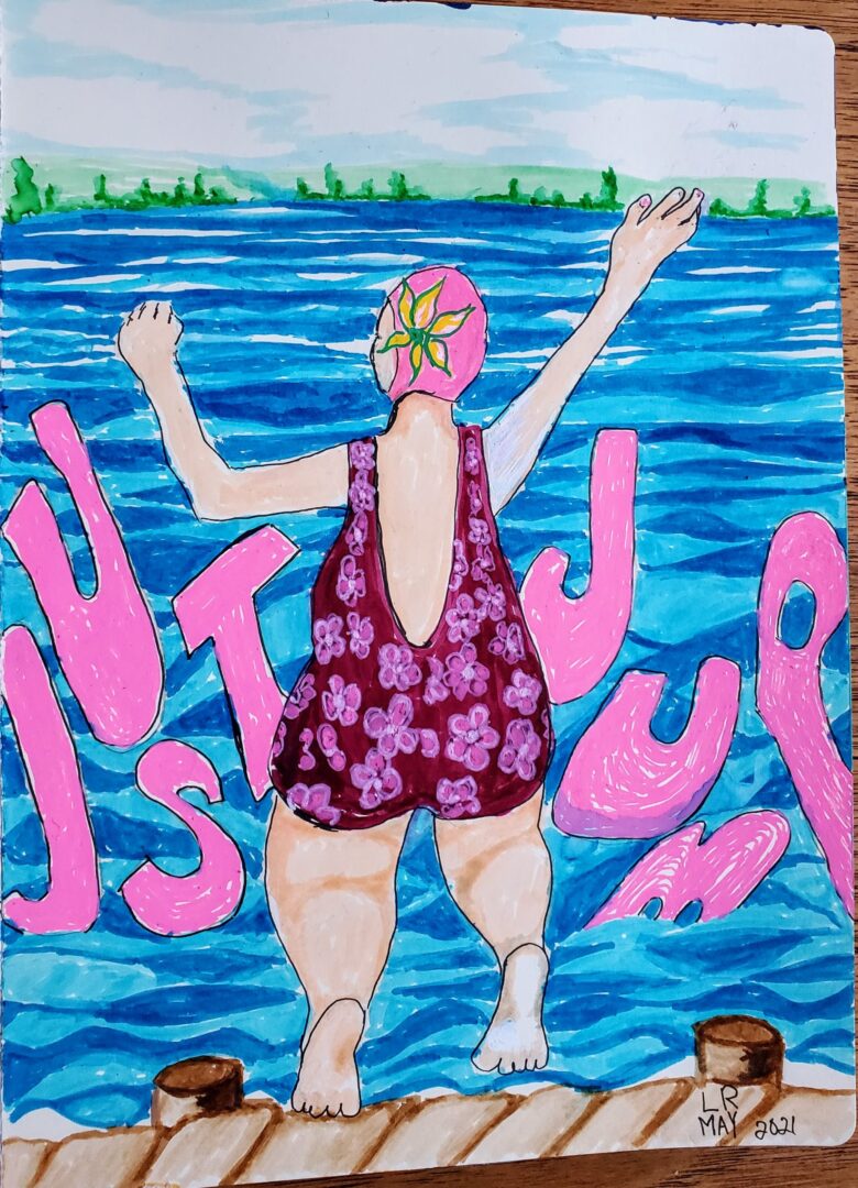 The theme was “water” and after all the trite and predictable ideas had played out, I was left with the fact that I hadn’t been swimming in ages and yet I love swimming. Sometimes other people’s ideas about what is allowable for a woman my age or my shape, shrinks my world or ends an activity before I am done with it. To heck with that. Just jump.