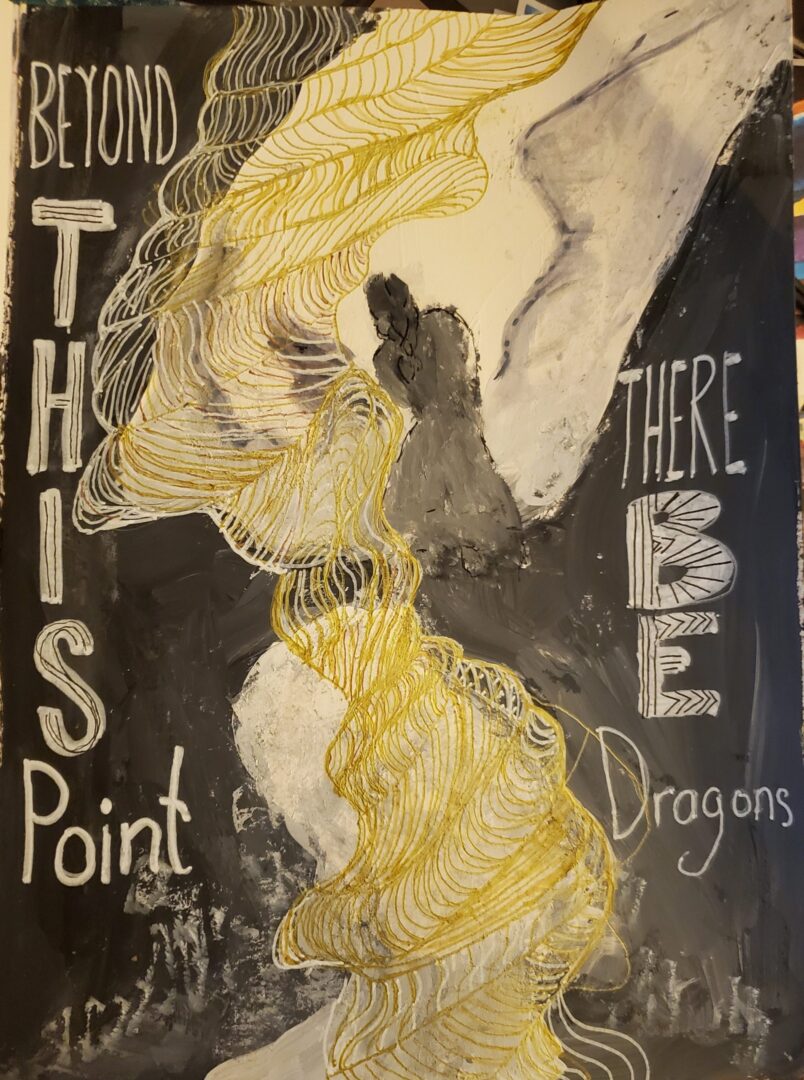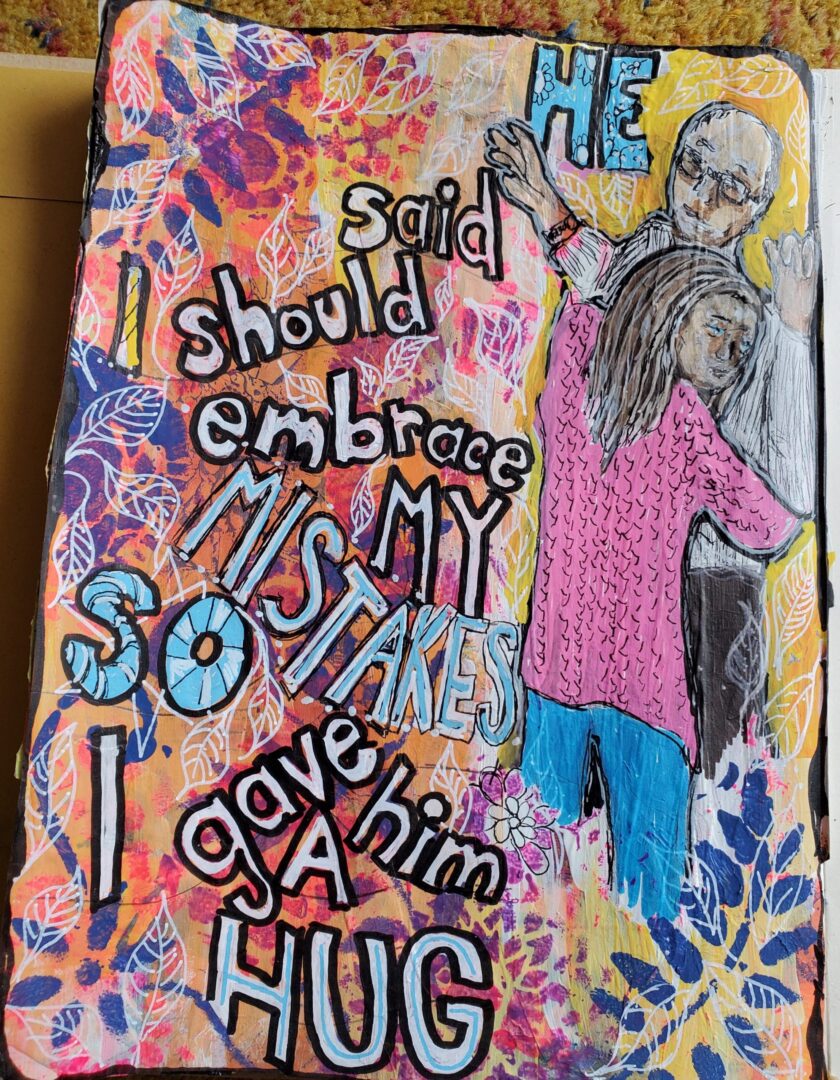 I got out my markers and pens to do a little highlighting and scribbled words. This allowed me to think about my discomfort a bit more. I realized there was a bit of a balancing act between maturity/learning, authenticity and ego. Perhaps it isn’t an accident that more women are drawn to mixed media because it is, when you think about it, a collaborative art form. We are creating mash-ups often drawing on the art of others. Women are socialized to be more collaborative. Like the butterflies in our group (and on my page) the art we incorporate carries the page forward in combination with our own. Authenticity is a great value but sometimes we get it confused with egotism (or at least I do) when we feel like our own voice has to speak the loudest. Maturity is being able to step back and let another voice speak sometimes and I think the Dina Wakely message of “I spill make my mark” is hilariously apt to these thoughts.