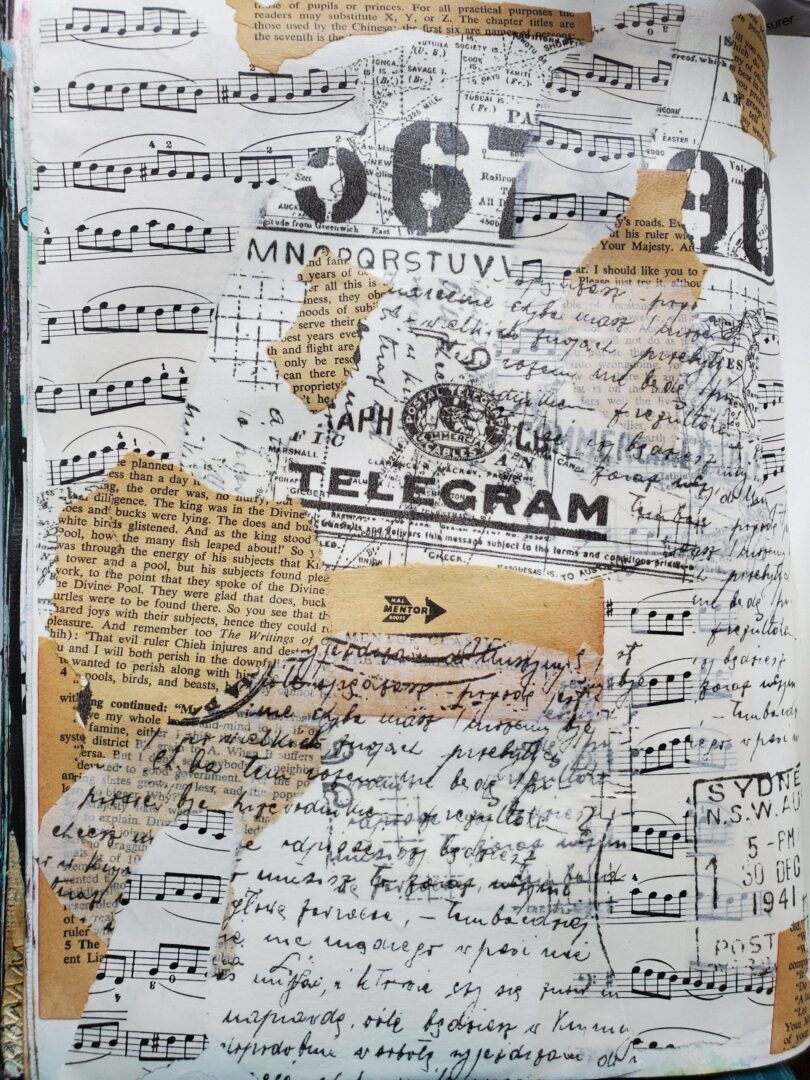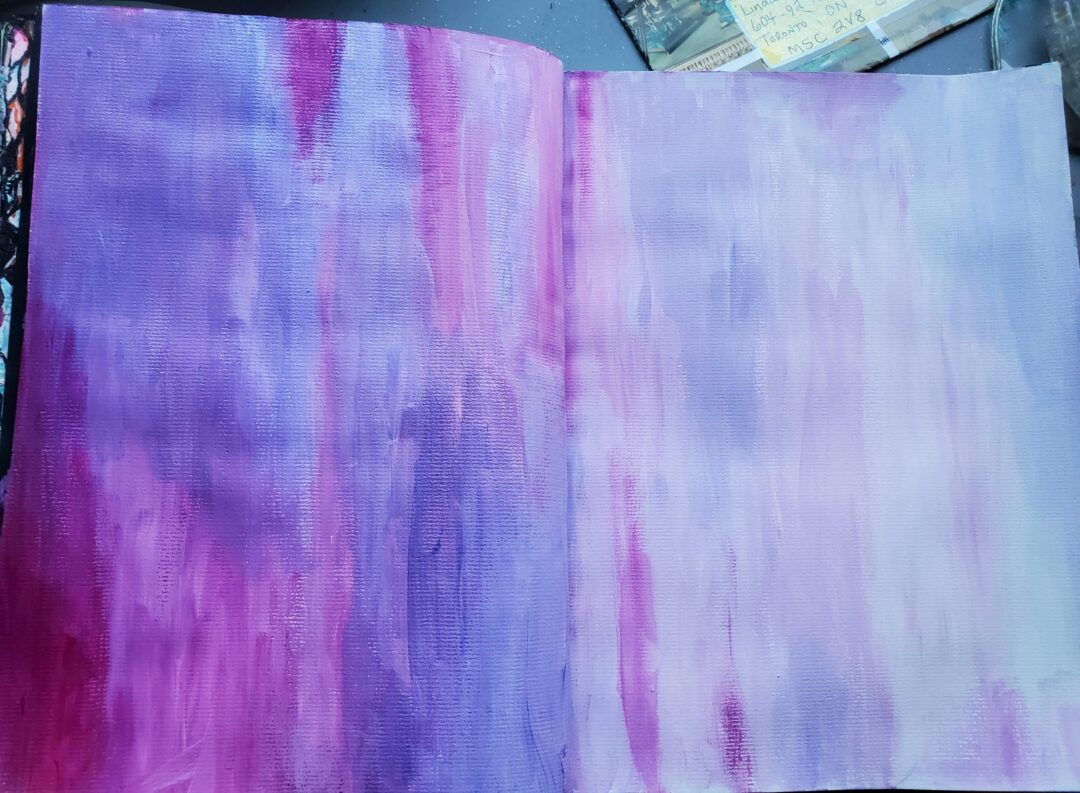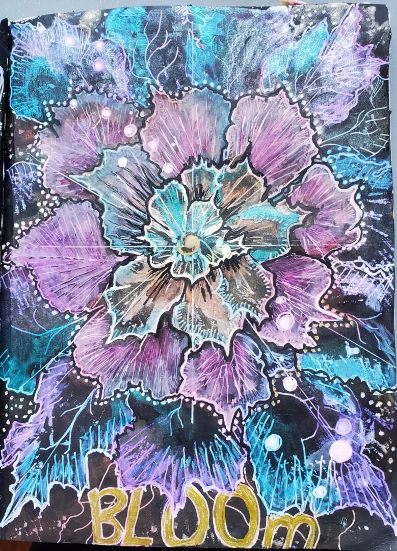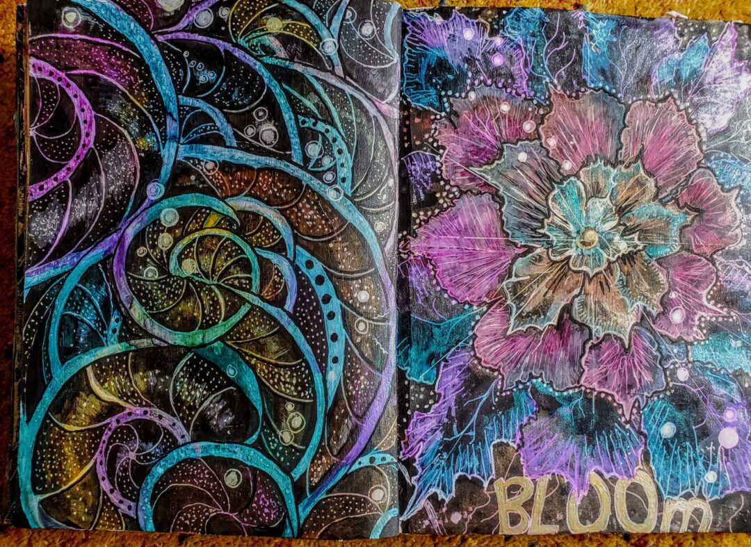 I sometimes like to work on black gesso pages. This page was inspired by a T shirt design that I saw someone wearing in a photo right after I heard the prompt for the week was “Colour I am”. The bird at the window speaks to me about my blue feelings of being confined during the pandemic. I am not totally a prisoner but sit at my window, not flying.